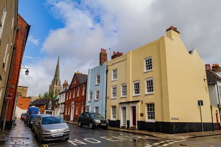 Narrow street architecture with typical english brick buildings and architecture in Winchester, England.