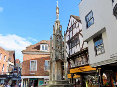Buttercross - monument with octagonal steps and pillar with figures - on High Street of old town in Winchester, England - September 20, 2021