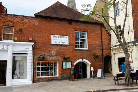 Chichester, England, UK - June 6, 2010: Shop windows in traditional buildings on the ground floor with direct access from the sidewalk. The traditional coffee house is in a brick building visible here