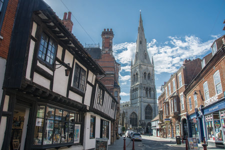 A view of the spire of Chichester Cathedral and St. Richards Walk in the historic city of Chichester in Sussex, UK.