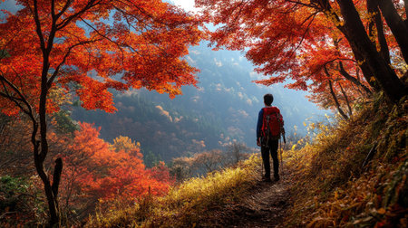 Hiker standing on a trail near Tsuta Onsen, taking in the breathtaking autumn scenery of red and orange leaves covering the forest.
