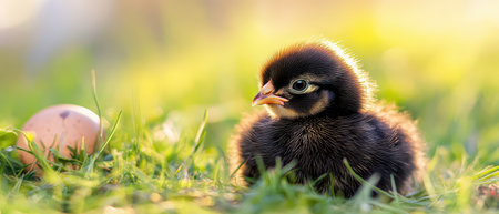 A tiny black chick sits on green grass near its unbroken egg basking in warm sunlight during early morning hours.