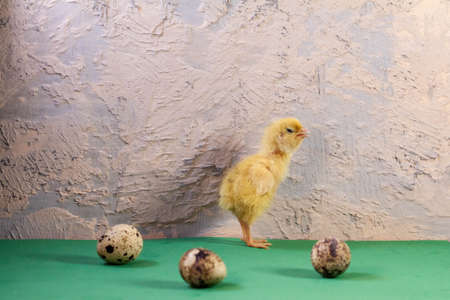 Newborn yellow chicken. Chick hatched from an egg. Chicks together with eggs background for the poultry farm.