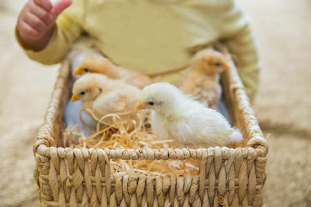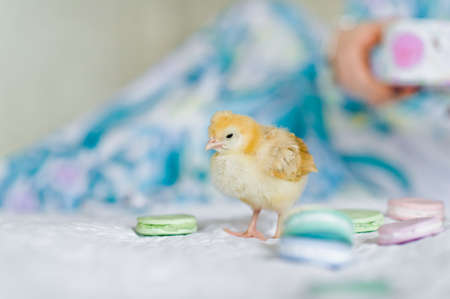Cute little baby chicken, close-up. The concept of a happy childhood.
