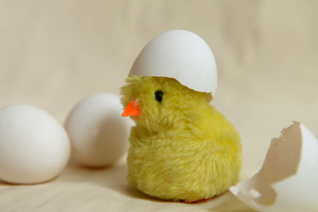 Newborn yellow chicken. Chick hatched from an egg. Chicks together with eggs background for the poultry farm.