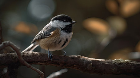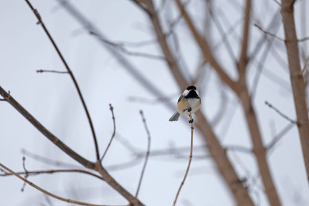 Close up portrait of a Black-capped chickadee (Poecile atricapillus) perched on a dead tree branch during late autumn. Selective focus, background blur and foreground blur.
