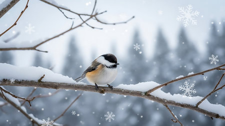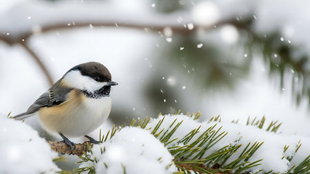 A small Black Capped Chickadee sits on a snow laden pine branch, with red berries visible. Snowflakes fall gently around it.