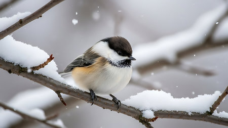 Black-capped Chickadee (Poecile atricapilla) on a branch with snow