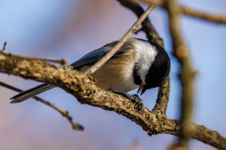 A black capped chickadee high above perch on a bare tree branch singing on a bright sunny day in wintertime in the forest