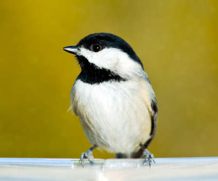 Chickadee perching on the edge of a plastic feeding tray and showing its profile