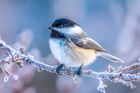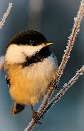 black capped chickadee on frosty branch