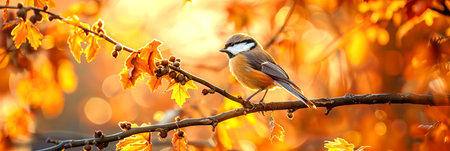Small and cute Parus Major funny birds on autumn forest wild nature outdoor background. Wildlife web banner with copy space. generated with AI.