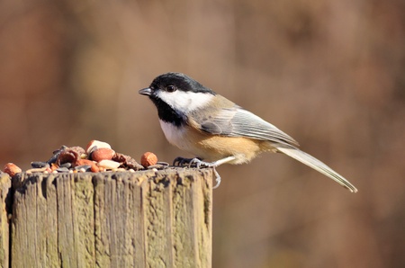 A black-capped chickadee perched on a post with bird seed.