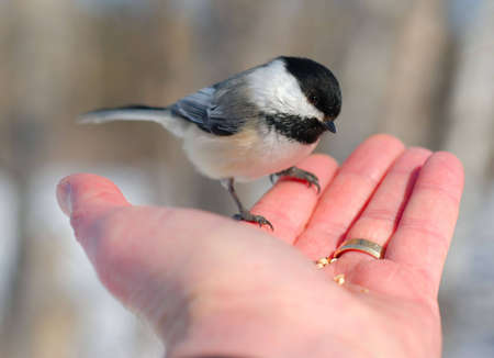 A little bird being fed from Caucasian hand in winter