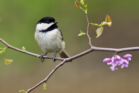 Black-capped Chickadee (Poecile atricapillus) perching on a Eastern Redbud Tree.