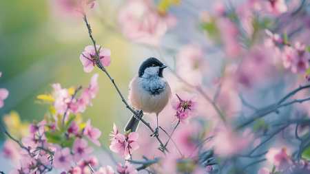 A small bird perches delicately on a branch amidst a profusion of soft pink blossoms. A serene springtime scene.