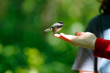 Feeding of Black-Head Chickadee from the palm in the forest Parus palustris, titmouse family