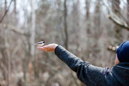 Chickadee eating from a lady's hand in the Canadian forest in winter