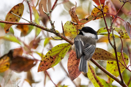 A small black capped chickadee sits calmly on a branch surrounded by vibrant autumn leaves. Its feathers blend well with the fall hues, highlighting the beauty of nature.