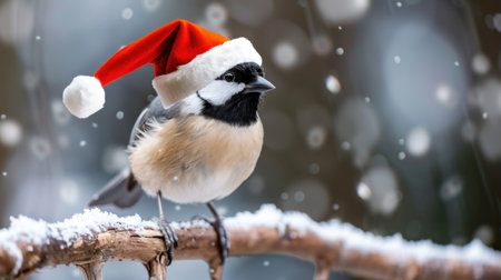 A delightful bird adorned with a Santa hat sits on a snow-covered branch, embodying the festive spirit of winter in a serene natural setting.