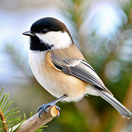 Black capped chickadee (Parus atricapillus) perched on a pine branch in Febrauary, horizontal