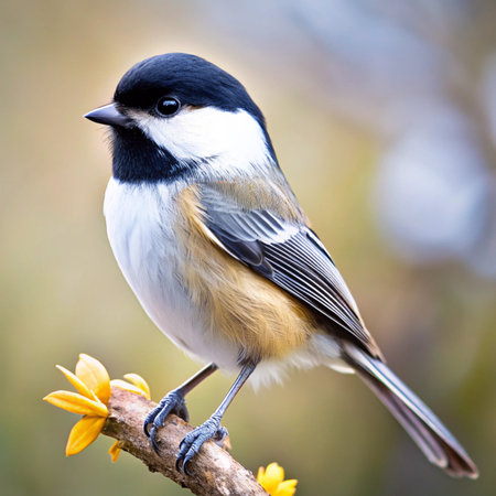 A black-capped Chickadee, also called Poecile Atricapillus, is perched on a branch