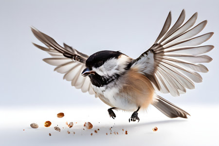 Black-capped Chickadee (Poecile atricapillus) with wings outstretched, preparing to fly away from man's hand.