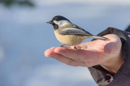 A tit sits on a man's hand and eats seeds. Taking care of birds in winter.