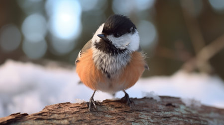 a small bird perched on a snowy wooden trunk, with a light orange and silver color scheme. the image is in the style of casey baugh, featuring light crimson and black tones. this photo raises ethical concerns and is available under the creative commons attribution license. ai generated