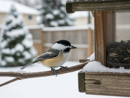 A chickadee perched on a bird feeder in winter.