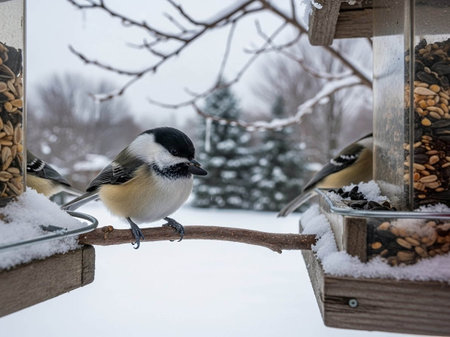 Group of Four Adorable Chickadees Perched on Feeder Amidst Heavy Winter Snow on a Cold Day