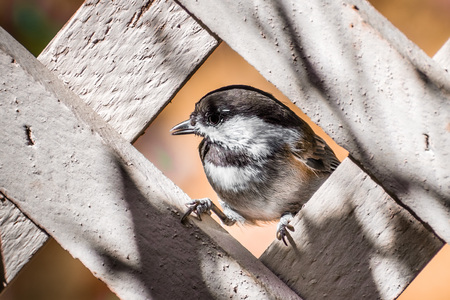 Close up of Chestnut backed Chickadee (Poecile rufescens) framed by the lattice of a wooden fence; San Francisco bay area, California