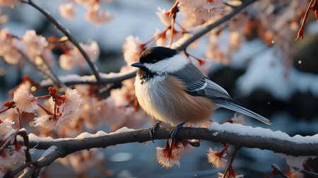 Great tit perching on branch, winter beauty generated by artificial intelligence