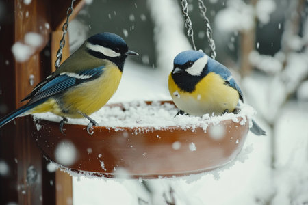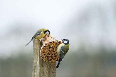 Charming small garden birds great tit and eurasian blue tit feeding in winter bird feeder
