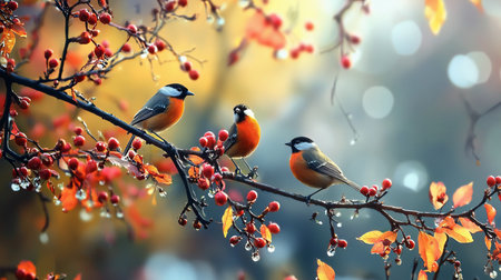 Three vibrant orange-breasted birds perch on a berry-laden branch amidst colorful autumn leaves, adorned with sparkling dewdrops. A serene fall scene.