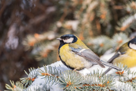 Cute bird Great tit, songbird sitting on the fir branch with snow in winter. Parus major