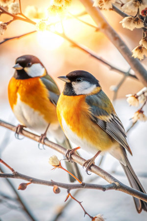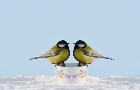 two beautiful bright birds tit and lapis lazuli are sitting on a branch in the winter garden
