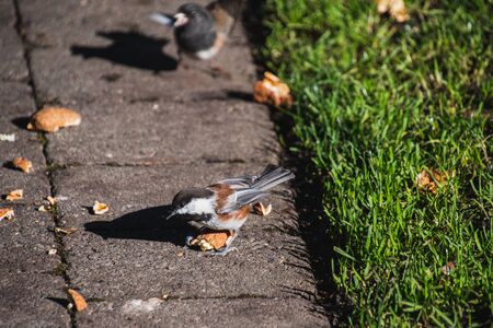 A picture of Chestnut-backed Chickadee Eating the Walnut . Victoria BC Canada
