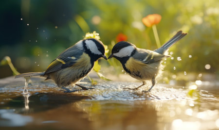 Small and cute Parus Major funny birds on autumn forest wild nature outdoor background. Wildlife web banner with copy space. generated with AI.