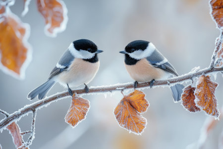 Two coal tits are perching on a frost covered branch with orange leaves in winter