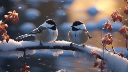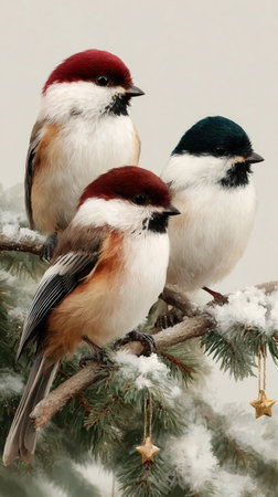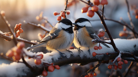 A beautiful winter scene featuring a trio of small chickadee birds resting in a row on a snow-covered branch adorned with bright red berries against a soft, blurred background.