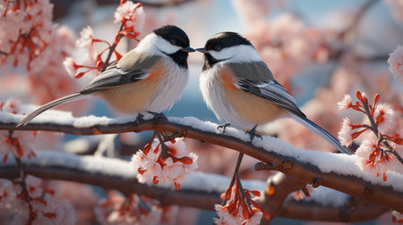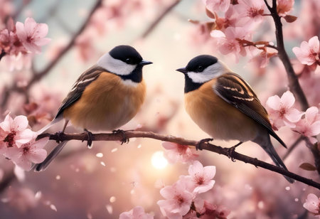 This enchanting image features two vibrant blue tits perched on a flowering branch, surrounded by delicate pink blossoms. Capturing the essence of spring, the scene portrays tranquility and natural beauty in a charming garden setting.