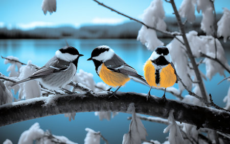 A Tranquil Winter Gathering of Colorful Birds Gracefully Perched on Snow-Dusted Branches