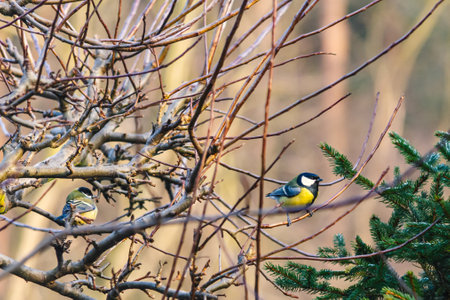 Group of little songbirds perching on branch of tree on yellow autumn background. Great tit (Parus major)