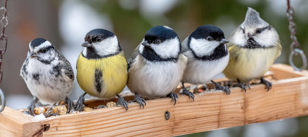 Group of little birds perching on a bird feeder with sunflower seeds. Winter time