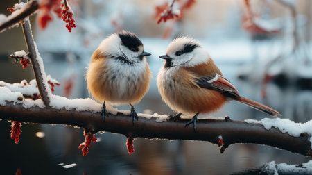 Two birds perched on a delicate tree branch with red berries covered in snow