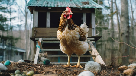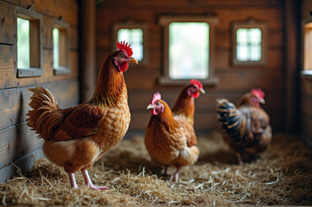 AI generated realistic hen standing in a rustic chicken coop with soft light filtering through the window highlighting its feathers. Natural shadows and textures enhance the cozy atmosphere.