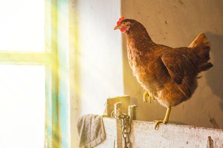 Image - Hen standing in dirty hen house on sunny day. Illuminated Hen with natural light posing to camera in farmyard (garden). Close up of chicken standing on the edge of wooden table in barn yard