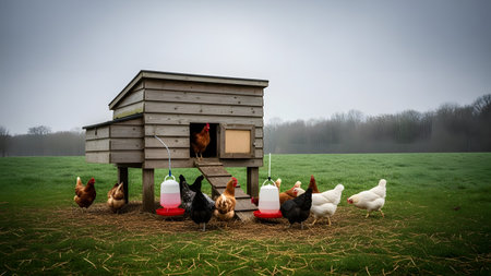 A wooden chicken coop situated in a lush green field with free-range hens grazing nearby. The overcast sky and open pasture emphasize sustainable and organic farming practices.