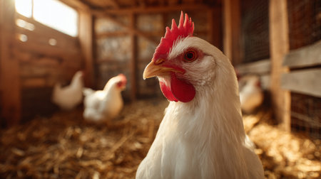 A white hen stands prominently in a well-lit poultry farm, surrounded by other chickens in a spacious, rustic setting.